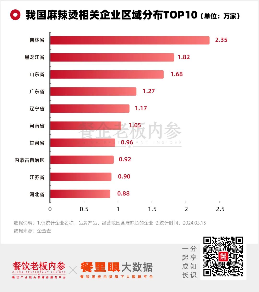 企查查数据显示,我国现存麻辣烫相关企业19.06万家。近十年,注册量呈整体增长态势,2023年注册量同比增长25.51%至4.14万家。从区域来看,吉林现存2.35万家麻辣烫相关企业,位居第一。黑龙江、山东分别现存1.82万家、1.68万家麻辣烫相关企业,位居前三。此次凭借天水麻辣烫火爆出圈的甘肃位居全国第七。