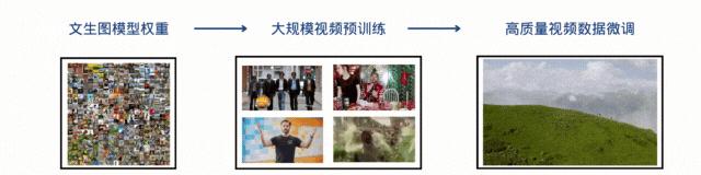 第一阶段通过大规模图像预训练,借助成熟的文生图模型,有效降低视频预训练成本。