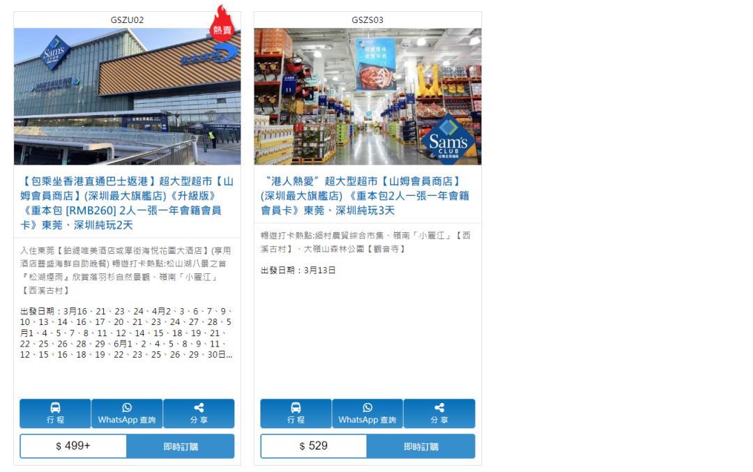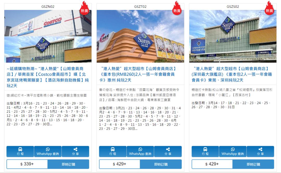 其中,东瀛游也于去年末率先推出“东莞、深圳纯玩两日团”,1月份每日两团、合共超过50团成行出发 ,行程的其中一天便是山姆购物;团费每位最低429港元起(约合人民币393元),其中含市场价为260元人民币的山姆会员卡,该团推出不过数日便全额爆满。随后东瀛游又加推惠州2天山姆团。