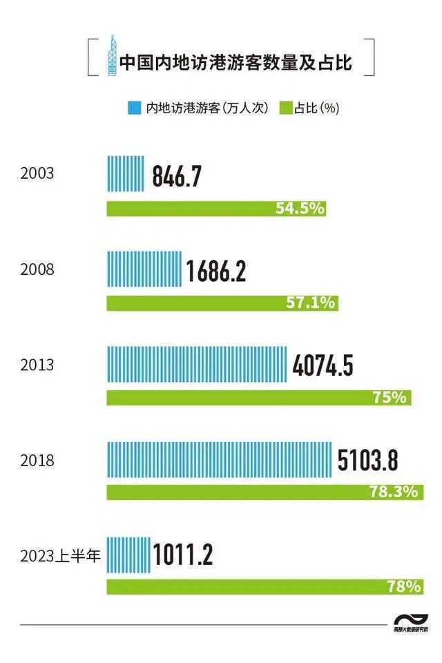 但内地赴港游客热情却没有丝毫减退,过去20年,粤港两地的旅游格局,几乎就是由内地游客赴港购物“主导”,牢坐天平一端。即使是2023年,内地仍是最大的访港旅客市场。