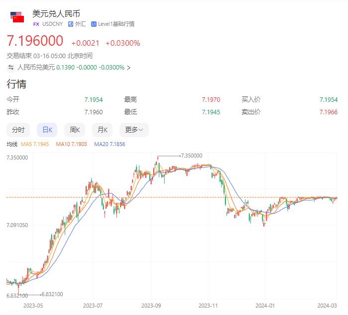 同时,自去年5月在岸、离岸人民币对美元汇率双双跌破“7”关口后,人民币继续走弱。近两个月以来,人民币兑美元汇率在7.1-7.2点位之间波动。