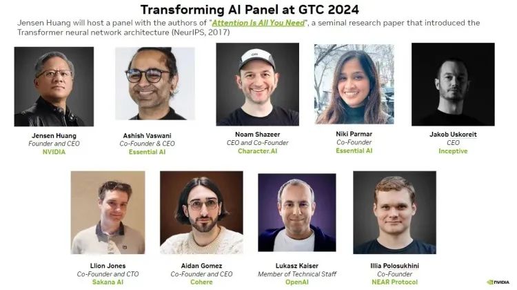 除了老黄的演讲,英伟达还集齐了Transformer的八位作者。 这些人早已各奔东西,这个panel几乎可以展示英伟达在今天的AI领域有多么如日中天。 我们届时也会在现场直击这场panel。 欢迎关 注。