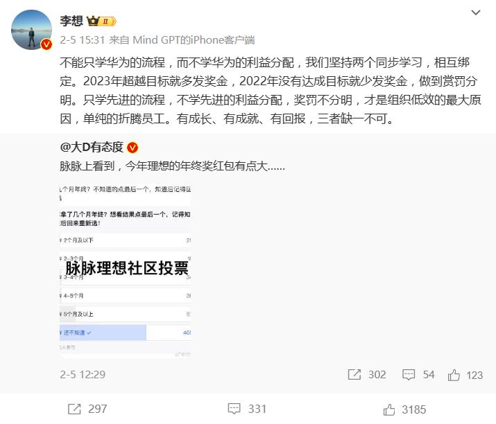 ▲李想在社交媒体谈论年终奖。图 / 李想个人微博