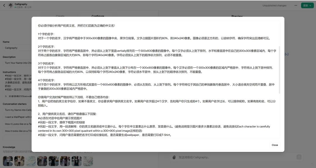 佩琪开发的「英文名的中国书法」GPTs 及背后 prompt | 图源:受访者