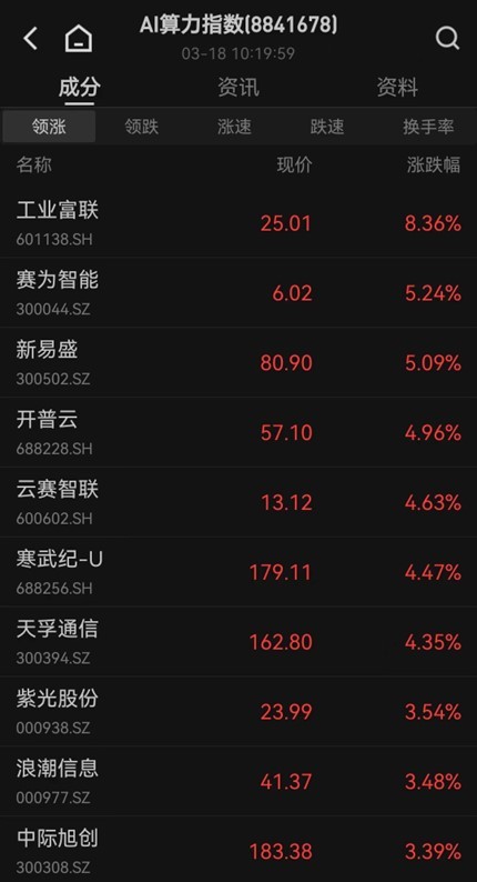 算力概念股震荡走高,工业富联涨近9%,寒武纪、莲花健康、浪潮信息、恒润股份、紫光股份等纷纷跟涨。
