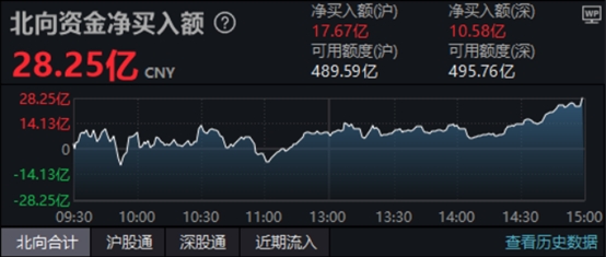 今日收盘,A股三大指数均创年内新高,沪指涨0.99%,深成指涨1.46%,创业板指涨2.25%;北向资金净买入28.25亿元。