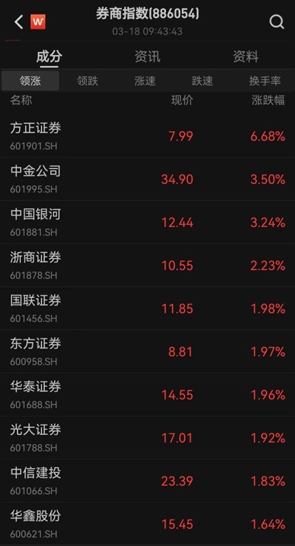 券商股早盘走强,方正证券封板涨停,中国银河涨超8%,华鑫股份、中金公司、浙商证券、首创证券、信达证券等跟涨。