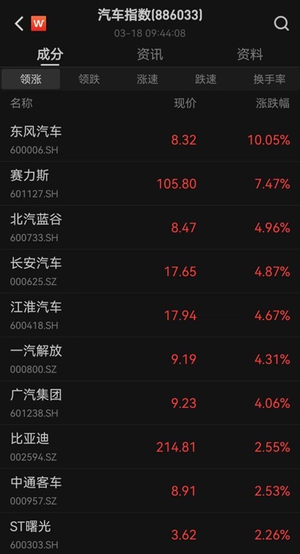汽车整车板块中,东风汽车2连板,赛力斯涨超7%,江淮汽车、北汽蓝谷、一汽解放、长安汽车等跟涨。