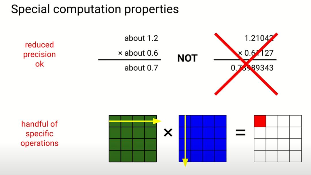 其次,神经网络中的大多数计算和算法本质上都是线性代数操作的不同组合,例如矩阵乘法和各种向量运算等。如果能够设计出专精于低精度线性代数运算的计算机硬件,就能够以更低的计算成本和能源消耗构建出高质量的模型。