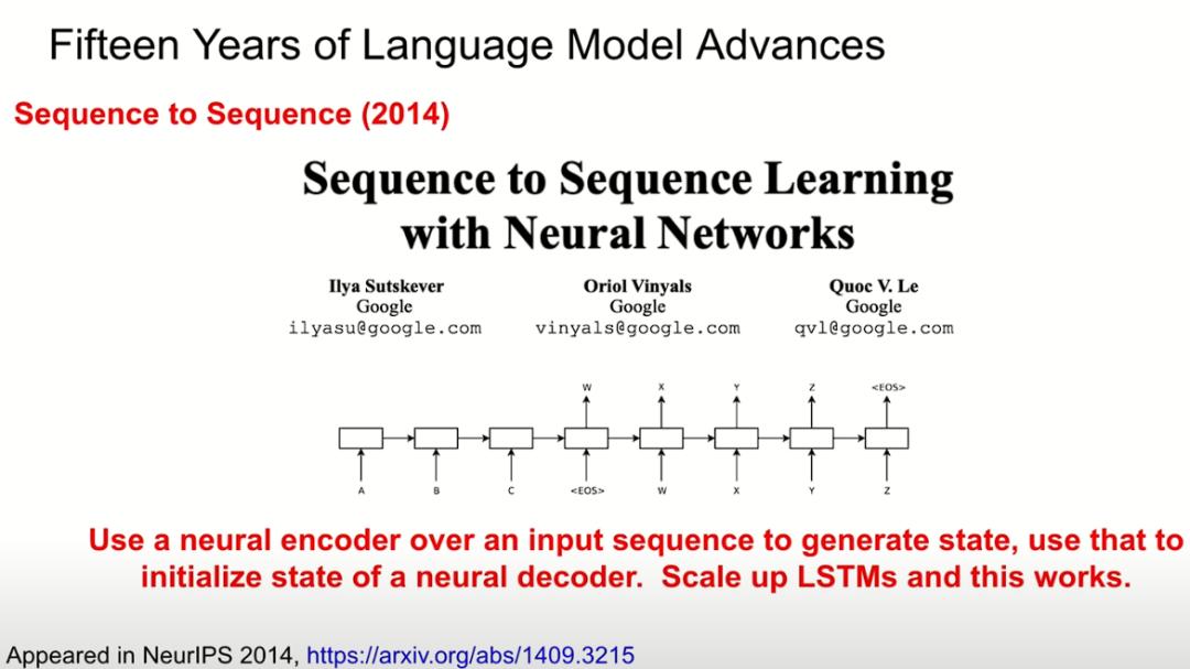 后来,我的同事 Ilya, Oriol 和 Quoc(编者注:这里面的 Ilya Sutskever 后来成为 ChatGPT 的头号功臣;Oriol Vinyals 加入 Deepmind 成为首席科学家;Quoc V. Le 留在谷歌创造了 LaMDA)开发了一个被称为“Sequence to Sequence”的模型,该模型利用神经网络,其中输入一个英语句子,通过递归神经网络(具体来说是长短时记忆网络)逐词更新状态,形成与先前所见单词对应的分布式表示。