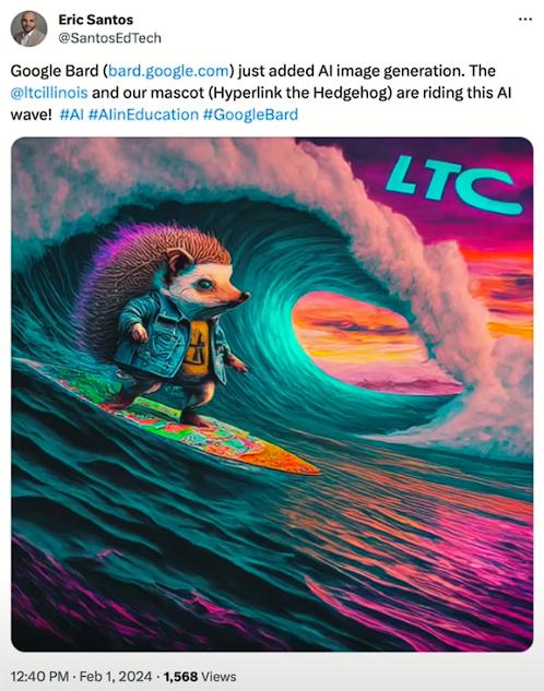 这种技术现已集成到 Bard 中,伊利诺伊州的 K-12 公立学校机构就利用此功能创造出了他们的吉祥物 Hyperlink the Hedgehog 的各种形象,比如下图这只在 AI 浪潮上冲浪的刺猬。