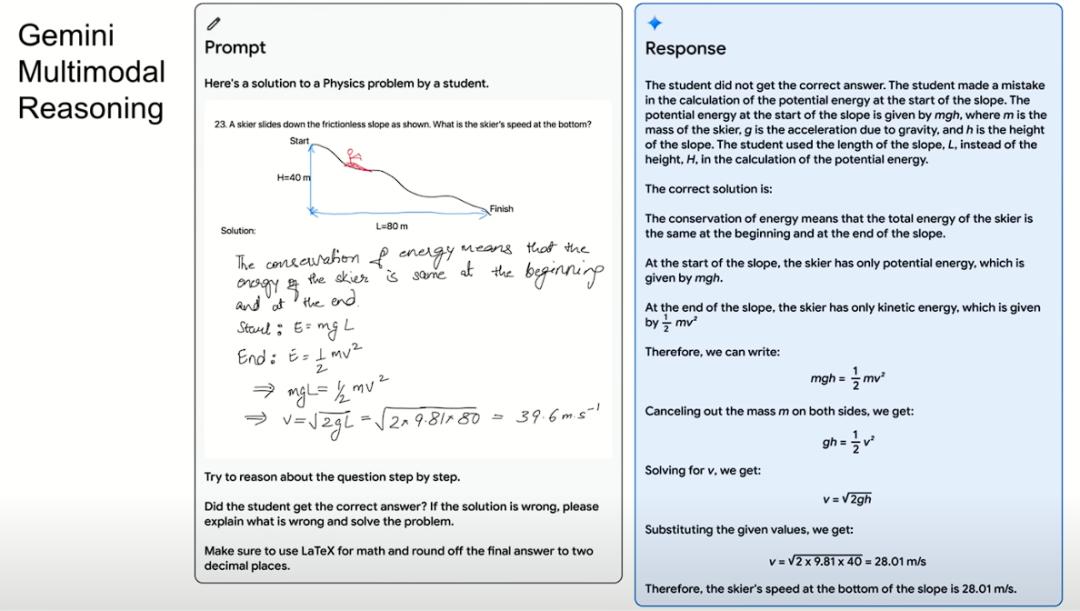 接下来顺着这个话题,我想谈论的是 Gemini 模型中的多模态推理能力。比方说,我们可以给模型提供一个多模态输入,包括一张学生手写的物理问题解决方案图片、相关的问题图片以及关于能量守恒的文字描述;然后,用“思维链”风格要求模型逐步分析这个问题,判断学生的答案是否正确,并在答案错误时指明错误之处及提供正确解答,同时要求在数学部分使用 LaTeX 格式并将最终答案精确到小数点后两位。