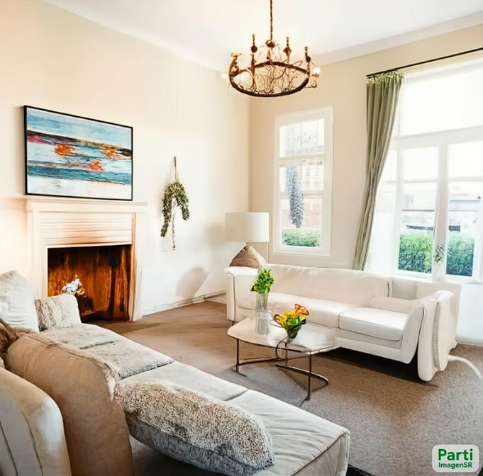 当然,还可以描述出非常细节丰富的场景:“一张客厅照片,内有一张白色的沙发和壁炉,墙上挂着一幅抽象画,明亮阳光透过窗户洒入室内。”