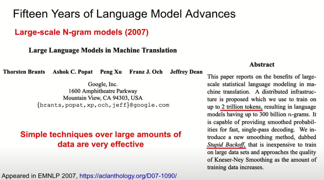 为此,我们建立了一个提供 N-gram 模型服务的系统,统计了超过 2 万亿个标记中每个五个词序列出现的频率,从而产生了大约 3000 亿种独特的五词组合,并将其存储在多台计算机的内存中以并行查询。为了解决数据稀疏问题,我们创新地提出了一种名为“Stupid Backoff”的算法,在找不到匹配 N-gram 时,会逐步尝试查找前缀直至找到合适的词汇序列。