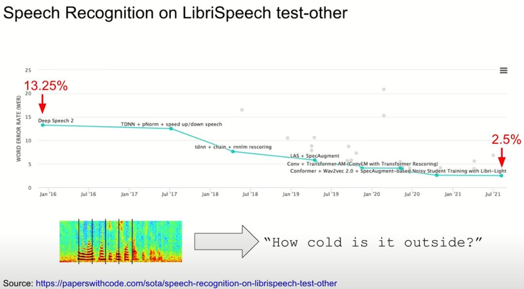 与此同时,语音识别技术也经历了类似的增长。以一个广泛应用的开源基准测试为例,衡量标准为词错误率(WER),即错误识别单词的百分比。短短五年内,这项指标从 13.25% 下降到了惊人的 2.5%,意味着原本每六七个词就有一个错误的情况,现在变成了大约四十个词才出现一次错误,极大地提升了语音识别系统的可靠性和可用性,使之能够支持诸如电子邮件口述等实际应用。
