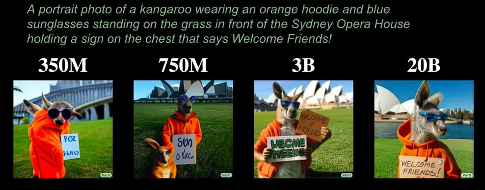 然而,当达到足够大的规模时,模型能生成包含悉尼歌剧院和清晰袋鼠形象的高质量图像,并准确地展示了“欢迎朋友”(Welcome friends!)的文字。这表明模型规模的重要性,过去十年中规模的扩大以及更好的训练方法和算法的进步,共同推动了生成结果质量的显著提升。