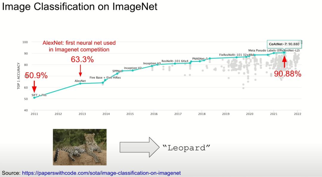 自那以后,进步的步伐并未减缓。ImageNet 挑战赛中的准确率已经从 63% 跃升至当前的 91%,这一数值甚至超过了人类在此类任务上的平均表现,考虑到有 1,000 多个类别以及诸如 40 多种不同犬种这样细微的区分难度,这样的提升是极其显著的。