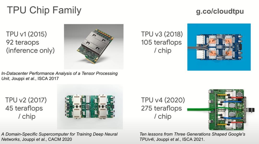 为此,谷歌研发了张量处理单元(TPU),这是一种专门针对低精度线性代数优化的系统架构。最初的 TPU V1 版本主要用于推断阶段,即当模型已经训练完成并应用于实际产品环境时,比如识别图像内容或语音识别。与当时使用的 CPU 相比,TPU V1 在能耗和计算性能方面实现了 30 至 80 倍的提升。