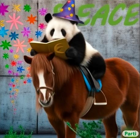 对于演示或其他用途所需的图片,这样的模型可以轻松创建符合要求的内容。甚至可以生成像这样详尽描述的画面:“一张黑白高对比度照片中,一只戴着巫师帽、正在阅读书籍的熊猫骑在马背上,背景为灰色混凝土墙,墙上有彩色花朵和‘和平’字样装饰,照片模拟单反相机日间拍摄效果。”