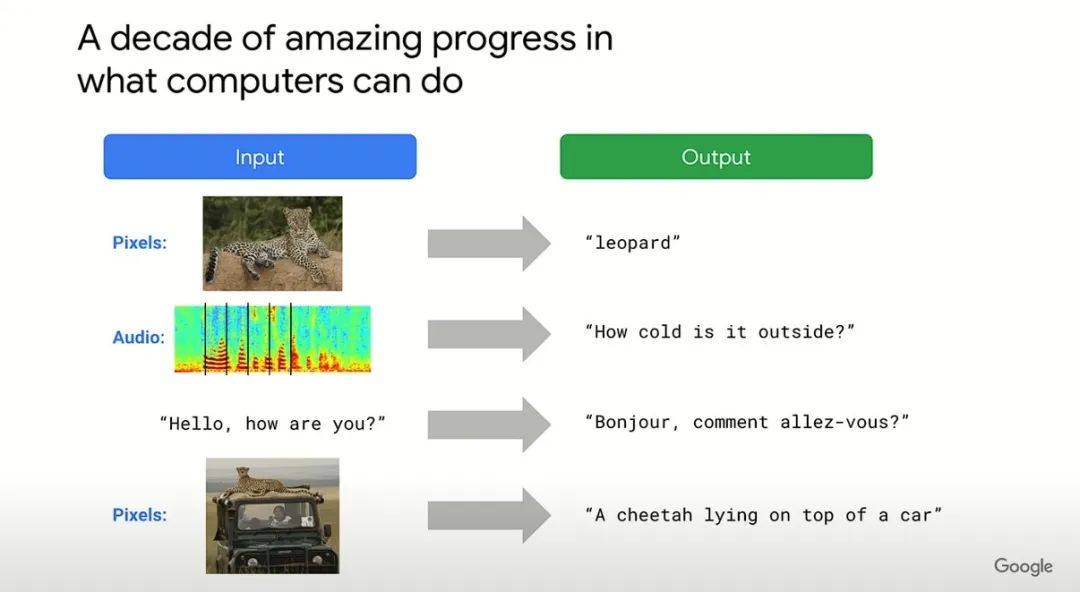 我刚刚应该带大家回想了一下十年前,事实上计算机技术在过去的十年间确实取得了令人瞩目的飞跃,特别是在机器学习和人工智能领域。从图像识别到语音处理、翻译以及生成式模型的运用,这些进步都极大地拓宽了我们与计算机交互的可能性。