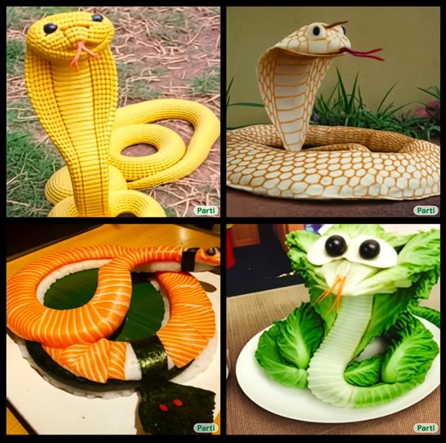 例如,“一列蒸汽火车穿越一座巨大的图书馆,画面采用伦勃朗油画风格”,或者“由玉米、煎饼、寿司或沙拉材料构成的一条巨型眼镜蛇”——我觉得其中生菜造型的眼镜蛇颇具创意,而玉米材质的也很有趣。