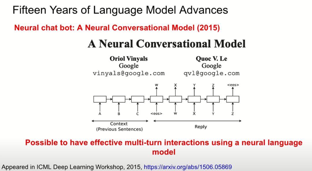 在这一系列发展中,神经语言模型和神经对话模型日臻成熟,如 Meena、OpenAI 的 GPT 系列,以及谷歌去年发布的 Bard 等。在此基础上,出现了基于 Transformer 架构的大型语言模型项目,如 GPT-3/4,谷歌研究院的 PaLM,DeepMind 的 Chinchilla,谷歌研究院的 PaLM 2 以及由我和我的同事 Oriol Vinyals 共同领导的 Gemini 项目。