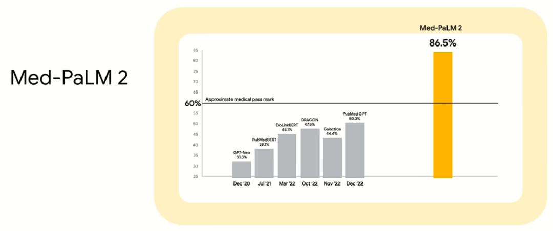 我的一些同事在 PaLM 和升级版的 PaLM 2 模型的研究基础上,取得了一项显著成果。PaLM 2 作为一个通用文本训练模型,经过针对医学数据集(包括医学问题和文章)的深化训练与微调后,产生了 Med-PaLM 模型,并且该模型首次在医学考试中超越了及格线。六个月后,他们又推出了 Med-PaLM 2,在特定医学考试任务上实现了专业级别的表现。这个例子确实证明了先拥有强大的通用模型,再进行领域适应性训练的巨大潜力。