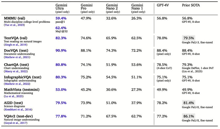 总体来看,Gemini 在研究涉及的 32 项学术基准测试中,于 30 项测试达到了最先进的水平。特别是在针对数学问题、一般推理或文本导向基准等方面,Gemini Ultra 与之前的最先进技术 GPT-4 相比,往往能取得更好的成绩。例如,在八个八年级数学问题上,最先进技术的准确性达到了 90%,而在 MMLU 这样涵盖化学、数学、国际法、哲学等 57 个学科的广泛问题集上,Gemini 的表现甚至超越了人类专家水平。