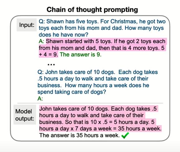 然而,当采用思维链的方式时,通过向模型展示逐步的解决过程,比如“肖恩起初有五个玩具,每次获得两个新玩具,所以总数是五个加上四个,等于九个...”,可以使模型被激发,去采取渐进的方式找到答案。说白了,就像幼教一样(观众大笑)。