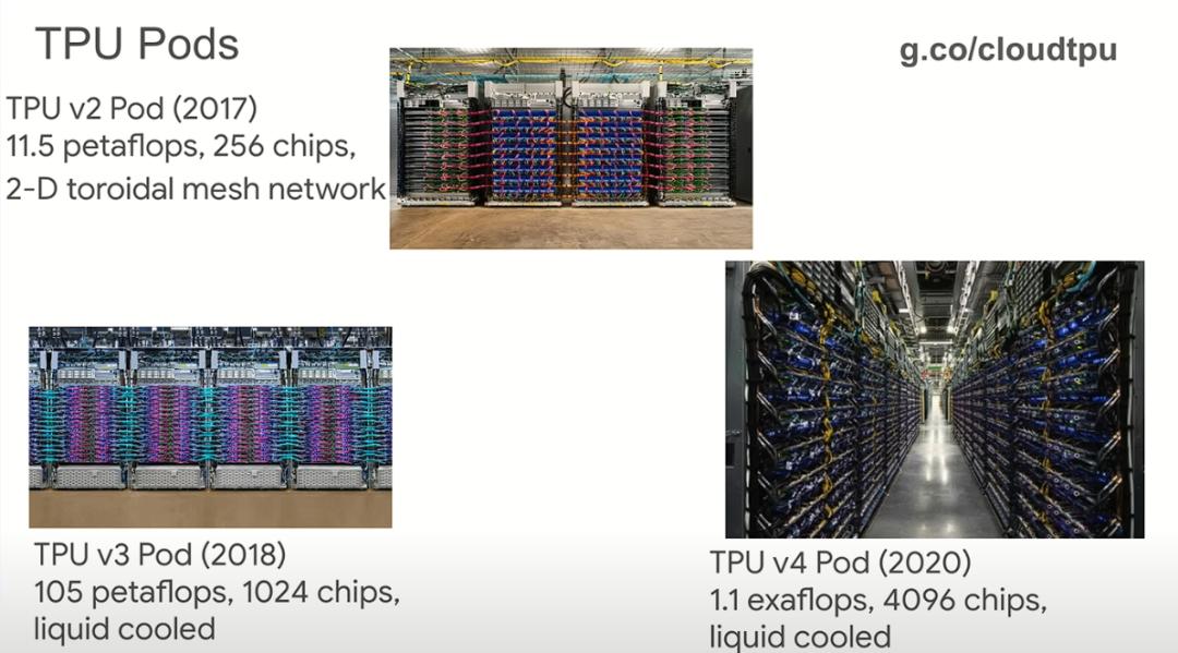 TPU V2 和 V3 版本不仅提升了单个芯片的性能,还开始关注大规模系统的设计,支持多个芯片协同工作进行模型的训练和推断。其中,TPU V3 采用了水冷技术来提高散热效率,而 TPU V4 则在外形设计上增添了时尚元素,加了一些五颜六色的酷炫电线(观众大笑)——其实还真挺酷的。