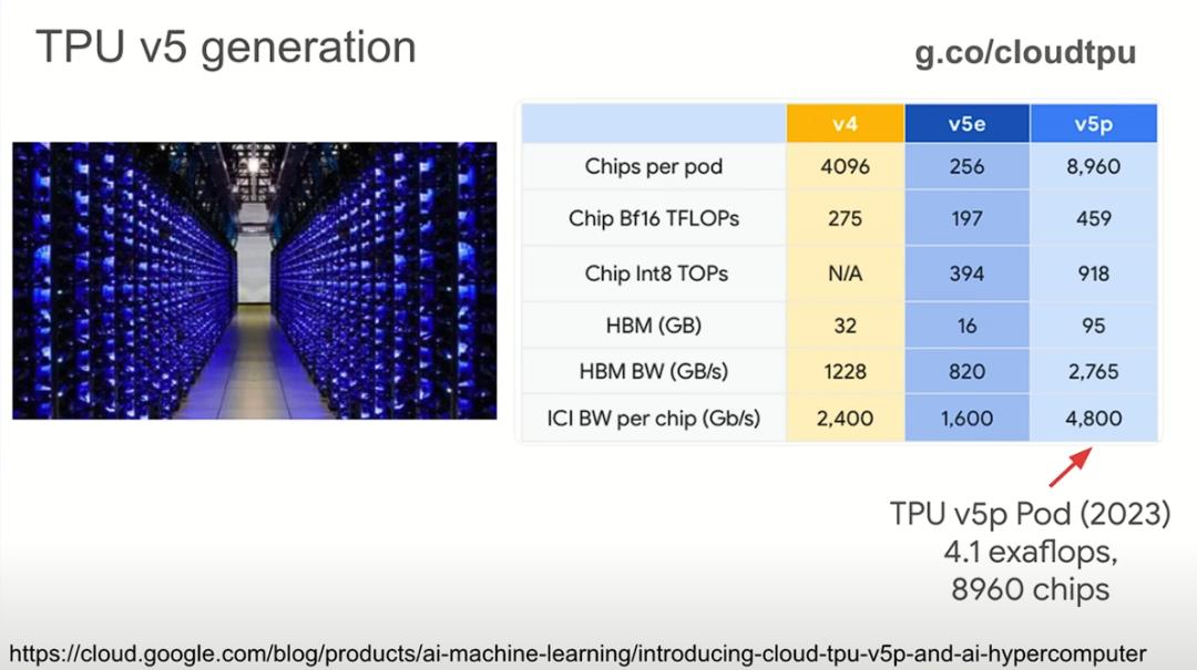 最近公开披露的 TPU v5p 系列有两种型号,一种用于推断,为拥有 256 个芯片的 Pod;另一种 v5p 芯片内存更大、芯片间带宽更高、内存带宽更充足,其 16 位浮点性能接近半 petaflop,并且混合精度性能是其两倍。最大的 v5p Pod 包含了近 9,000 个芯片,可提供 exaflop 级别的强大计算能力,为机器学习和人工智能的发展带来了前所未有的硬件支撑。