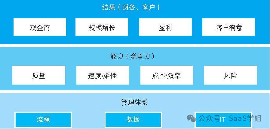TAM模型对变革价值的度量不仅包含财务/客户层面的结果类指标,还包含支撑结果达成的能力类指标,以及支撑业务能力提升的流程、数据和IT等管理体系类指标,是从三个层面展开对变革价值的全面度量。
