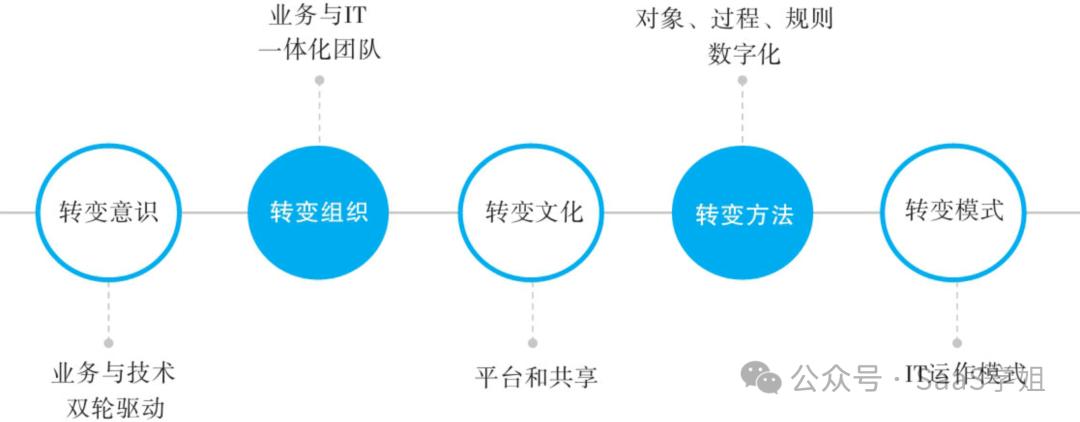 也就是说,组建业务与IT一体化团队,瞄准业务问题,找准转型的突破口并开展工作,彻底改变“企业IT部门跟业务部门两张皮”的情况。