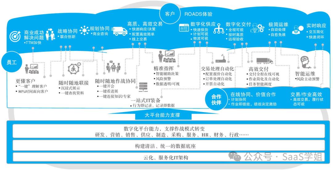 华为在经过3个月的调研分析,通过五看的具体方法论,将转型愿景确定为“把数字世界带入华为,实现与客户做生意简单高效,内部运营敏捷,率先实现ROADS体验,成为行业标杆”。