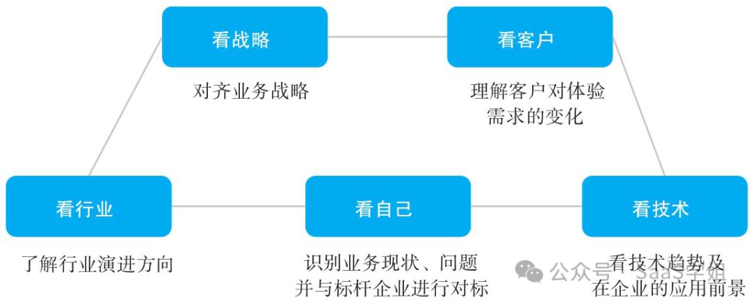 进一步细化,五看包括看战略、看客户、看行业、看自己、以及看技术。 通过五个方向的全面观察和思考,最终确认数字化转型的愿景。