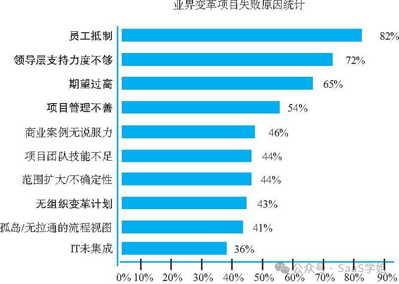 业界做过这样一份研究,探寻是什么导致了企业数字化项目失败,出乎意料的是,高居前三名的因素都来自于人,所以实施变革的关键,也是牢牢地抓住人这一核心要素。