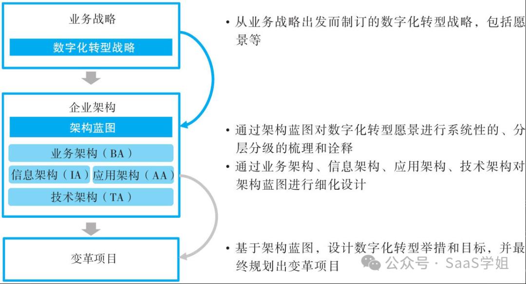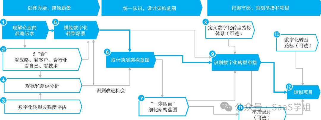 包括1 分析战略诉求并描绘愿景 2设计并细化架构蓝图 3识别数字化转型举措 4规划落地实施的项目。