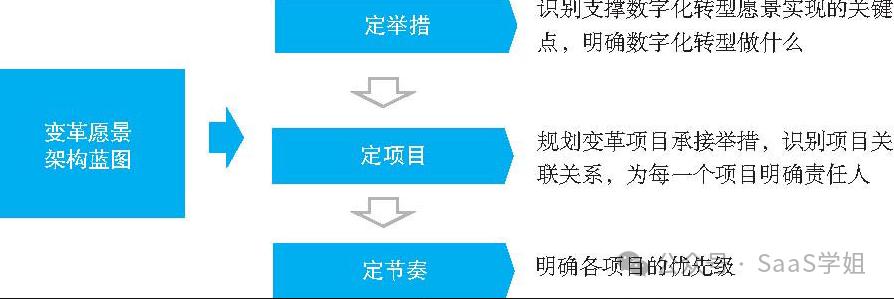 其中,五看是对内外部信息的全面搜集以及分析,以确定企业愿景和架构蓝图。三定是在此基础上,进一步确定举措、项目和节奏。