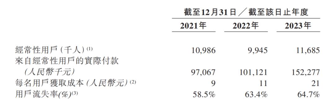 招股书显示,截至2023年底,趣致集团的注册用户为5005.6万人,但新增注册用户数明显出现波动,2021年最高为927.1万人,2022年降至606.5万人,2023年回升至703.9万人。与此同时,趣致集团的获客成本正在逐年上升,目前已从2021年的9元上涨至2023年的21元,其用户流失率也由58.5%上升至64.7%。此外,对比2021年,2023年的付费用户数与平均月活跃用户数也有下滑。