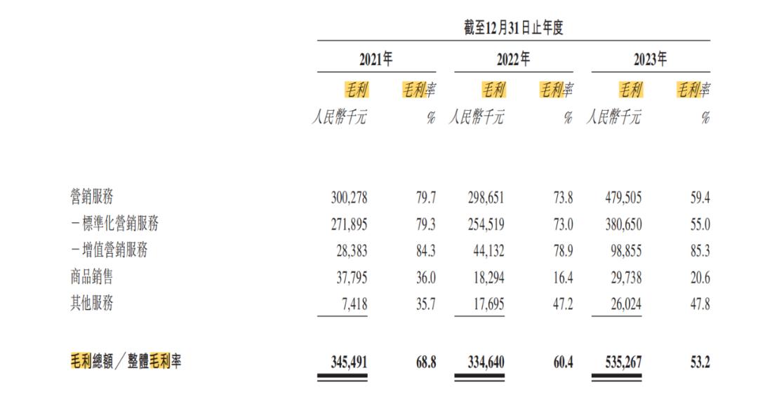 对比2022年,2023年企业的营销服务客户数有了一倍以上的增长。正因如此,2023年营销服务业务的毛利达4.80亿元,毛利率为59.4%;同期商品销售业务的毛利为2973.8万元,毛利率为20.6%。招股书显示,趣致集团已铺设7543台自动贩卖机,按此计算,每台机器每年的营销服务业务年毛利在6万元以上。