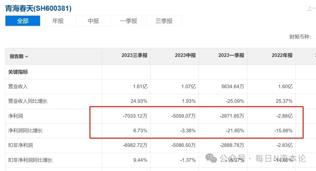 不过,这么“神乎”的产品也并未给其业绩带来多少亮色。青海春天的年报显示,其从2020年开始就陷入连续亏损的尴尬处境——2020年净利润亏损3.2亿元,2021年亏损2.49亿元,2022年亏损2.88亿元。2023年,青海春天预计净利润亏损2.22亿元至-2.87亿元。