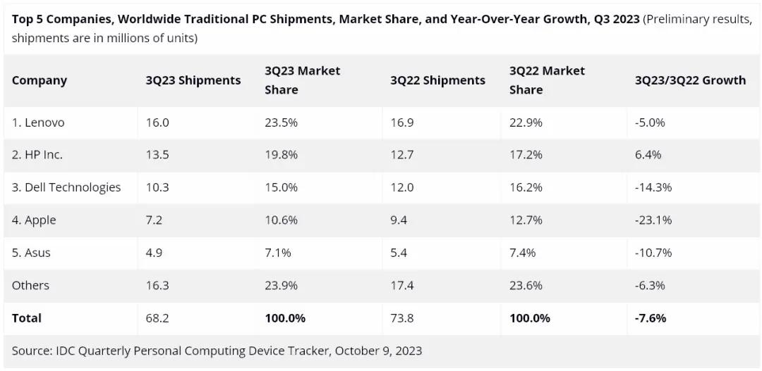 据IDC统计的2023年三季度全球PC出货量及市场份额统计,排名第一的依然是联想,出货量1600万台,市场份额23.5%;惠普位居次席,出货量1350万台,市场份额19.8%;戴尔、苹果、华硕分列3-5位。