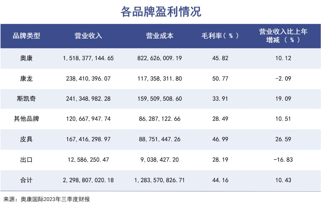 2023年前三季度末,斯凯奇贡献营收2.41亿元,同比增长19%,但34%的毛利率不及自有品牌奥康和康龙,营收占比仅10%出头。