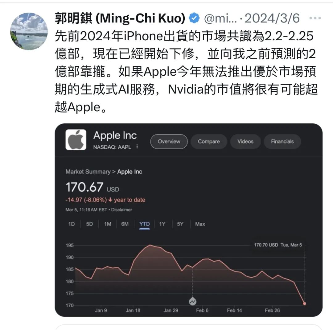 天风国际分析师郭明錤此前就曾评价,如果苹果今年无法推出优于市场预期的生成式AI服务,英伟达的市值很有可能超过苹果。