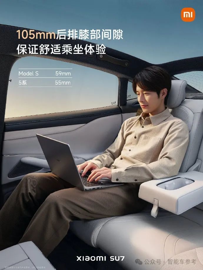 包括雷军自己也多次强调过,小米SU7拥有大空间,后排膝部间隙达到105mm,也就是前排座椅靠背到后排座椅之间的距离,俗称的后排腿部空间。