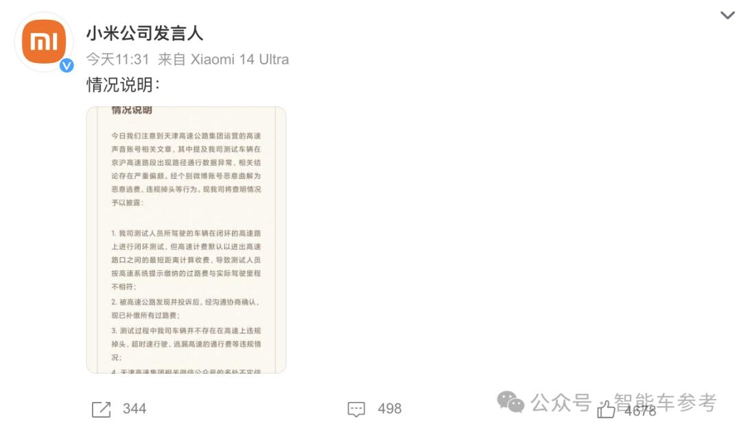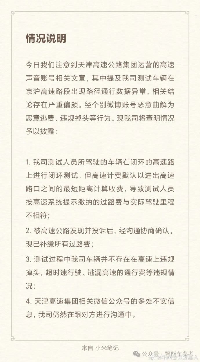 小米公司表示,测试车辆因为是在高速公路上进行闭环测试,所以导致高速计费系统计算的距离和实际行驶里程不一致,现在公司已经补缴过路费。并强调除此以外没有其他违规行为,同时还指出天津高速发布的内容有多处不实之处。