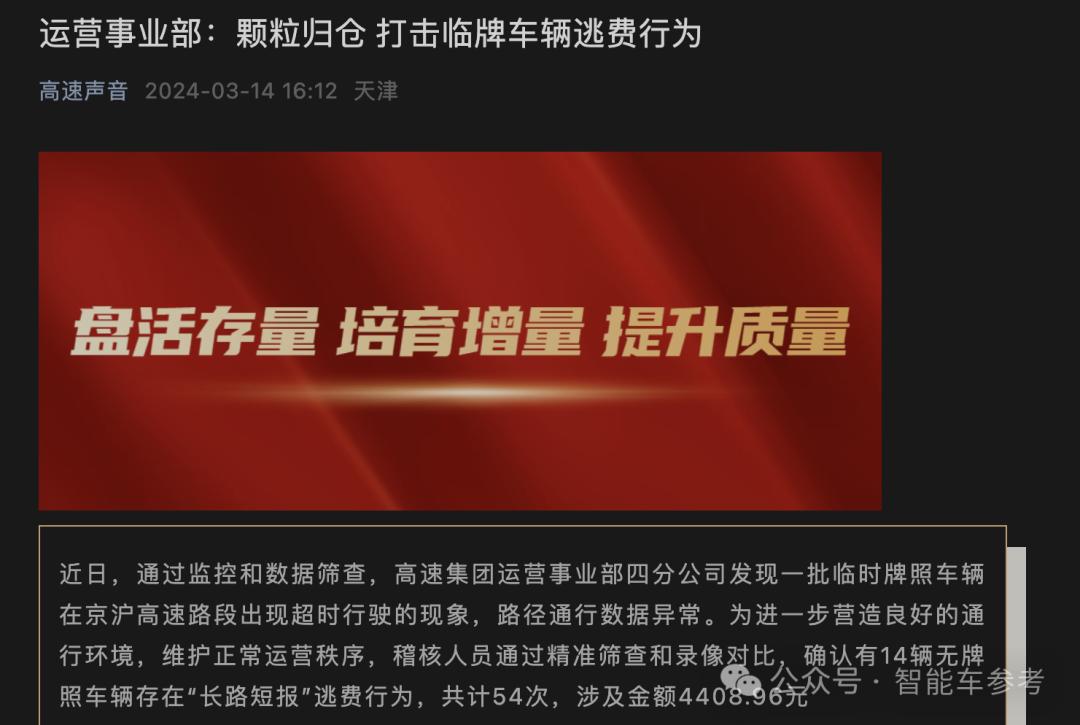 天津高速通过公众号高速声音,公布公司最近解决了一起临时牌照车辆逃高速费的行为。