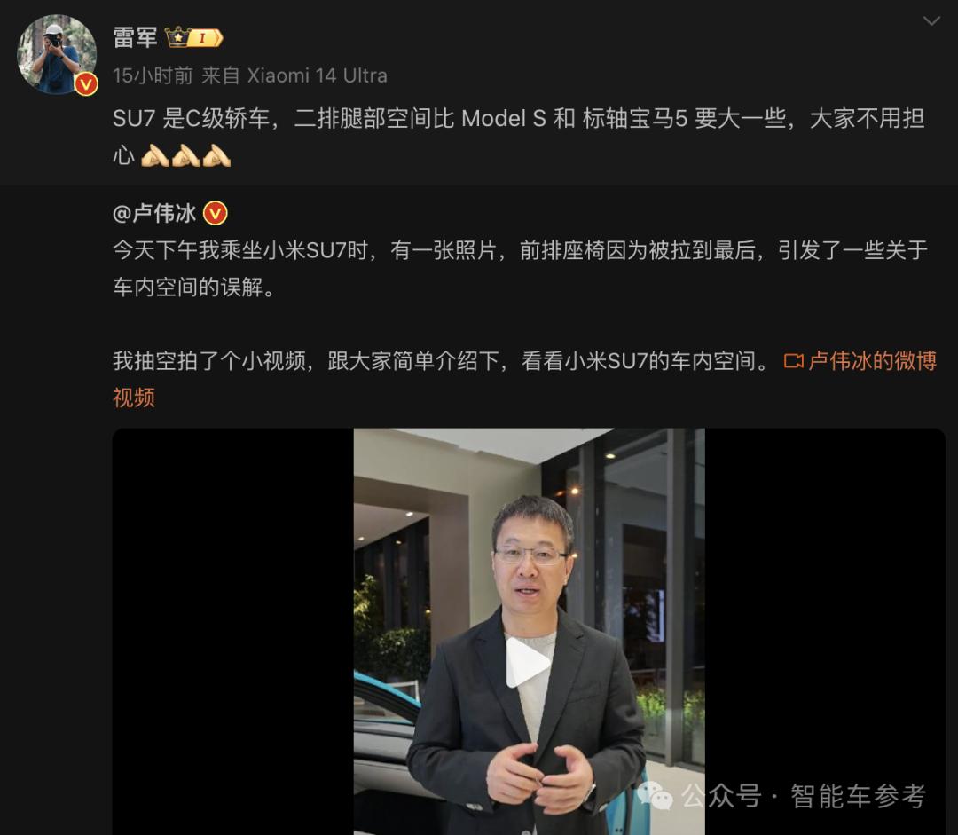 雷军也被惊动了,亲自上线辟谣,表示SU7是C级轿车,二排腿部空间比Model S和标轴宝马5还要大,大家不用担心后排空间不足。