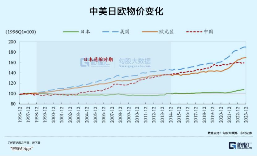 奇怪的是,中、美、欧印钞,物价都有很明显的上涨;只有日本,物价基本没变。