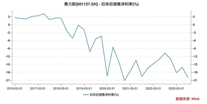 尽管如此,扣非后的赛力斯净利润仍然是亏损的,自2021年至今赛力斯均未能摆脱亏损的阴影,2023年推出问界M7后亏损还出现了放大的趋势。